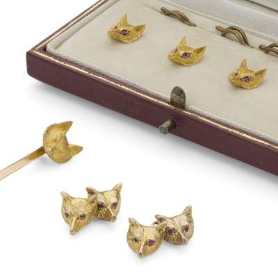 each modelled as a fox's head with ruby cabochon eyes, in a fitted case signed Garrard; together with a pair of similar cufflinks, facetted ruby eyes, chain links, stamped 9ct; an Edwardian 15ct gold tie pin, the flat bar with similar fox's head terminal