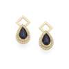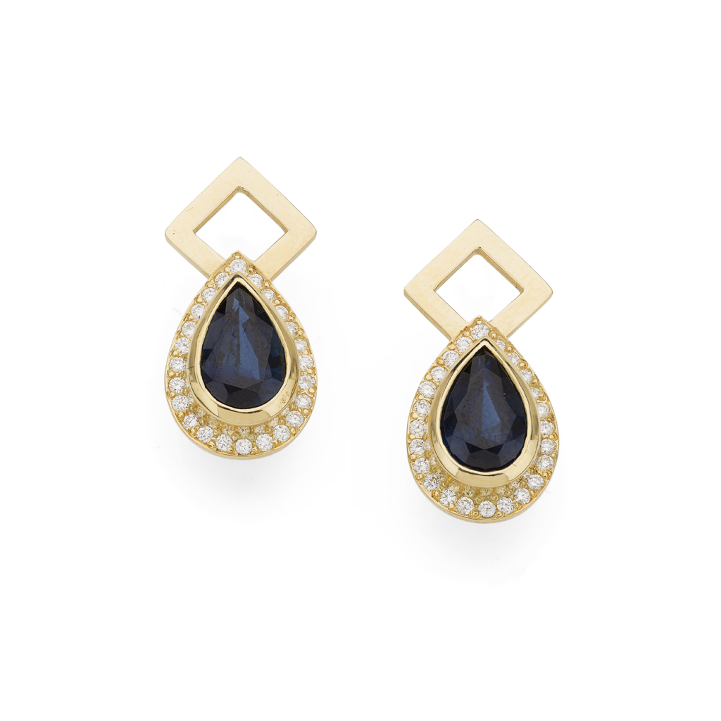 each collet set with pear cut sapphire in a border of small round cut diamonds, below a pierced angular design, to post and butterfly fittings, modelled in 18ct gold