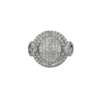 the central circular cluster invisibly set with princess cut diamonds, in a double border of small round brilliant cut diamonds and two collet set larger round brilliant cut diamonds, each shoulder also set with a circle of round brilliant cut diamonds, to a plain white metal shank, stamped 18k 750