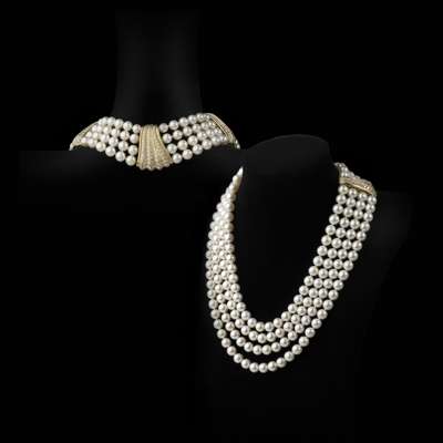 composed of four rows of uniform cultured pearls, set with two ribbed round brilliant cut diamond set spacers and similar feature clasp
