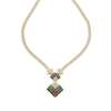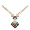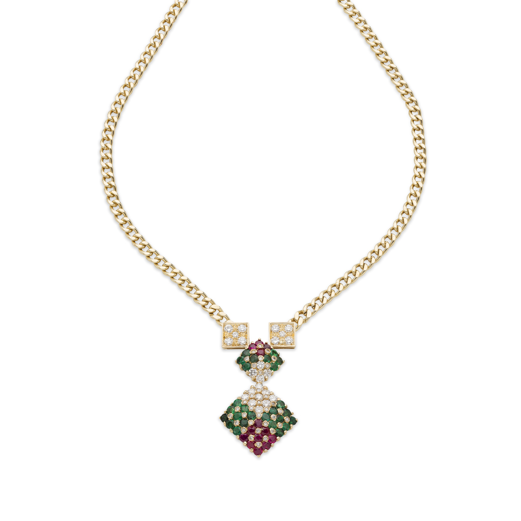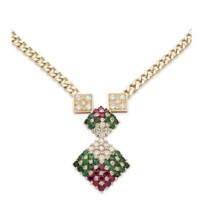 composed of two graduated square links, each set with round brilliant cut emeralds, rubies and diamonds, suspended from two square links each set with five graduated round brilliant cut diamonds, to an integral flattened curb link chain, stamped 750