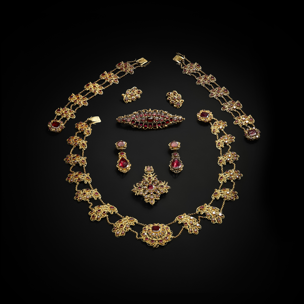 comprising a necklace, two bracelets, a pair of brooches, a pair of earrings and a pendant brooch, all modelled in unmarked yellow metal filigree in scrolling foliate design, set throughout with foil backed garnets; together with an associated brooch; all in a fitted box