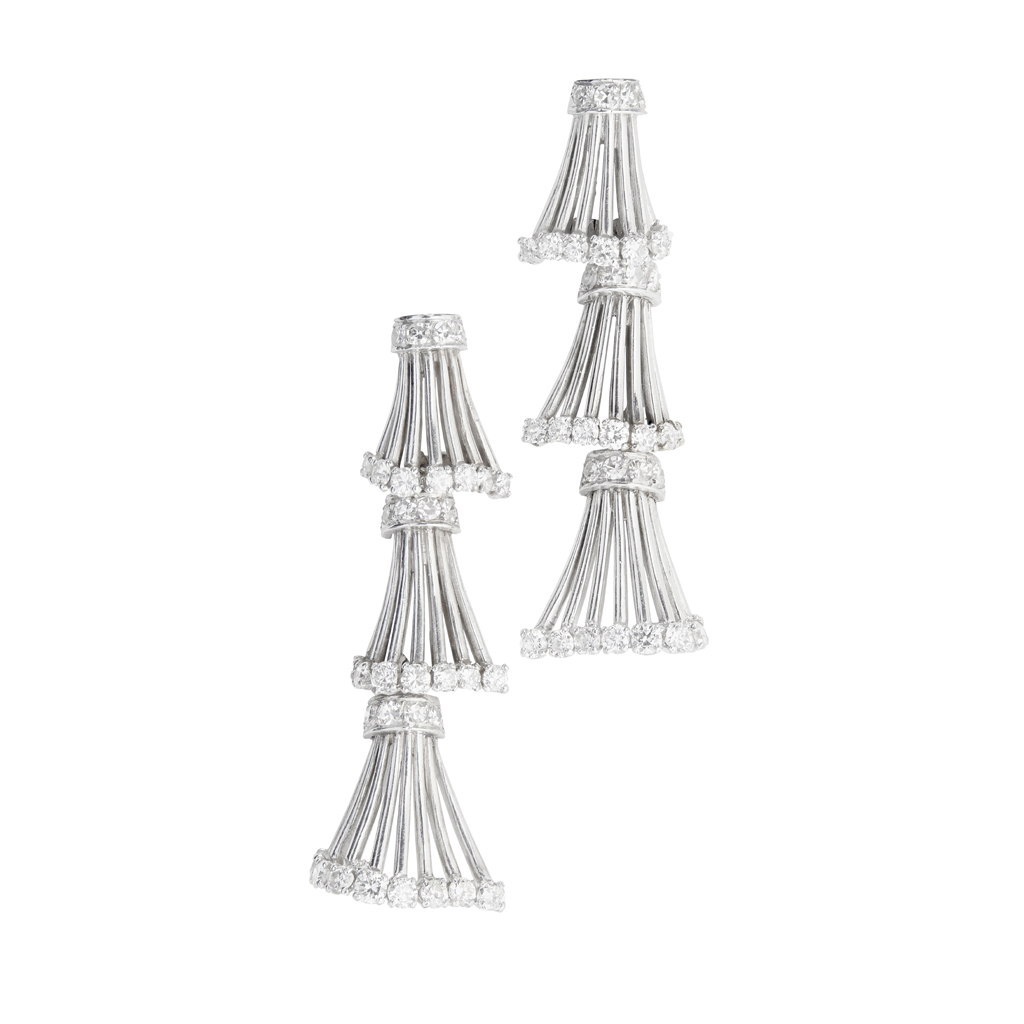 each composed of three articulated tiers of tassels, set with graduated round brilliant and eight cut diamonds, to clip fittings, each marked on upper tassel, one further marked to clip