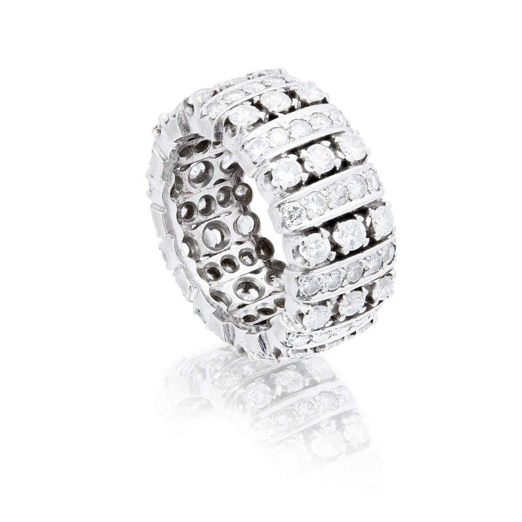 of broad design, composed of alternating rows of three round brilliant cut diamonds and five smaller round brilliant cut diamonds, modelled in an unmarked white metal