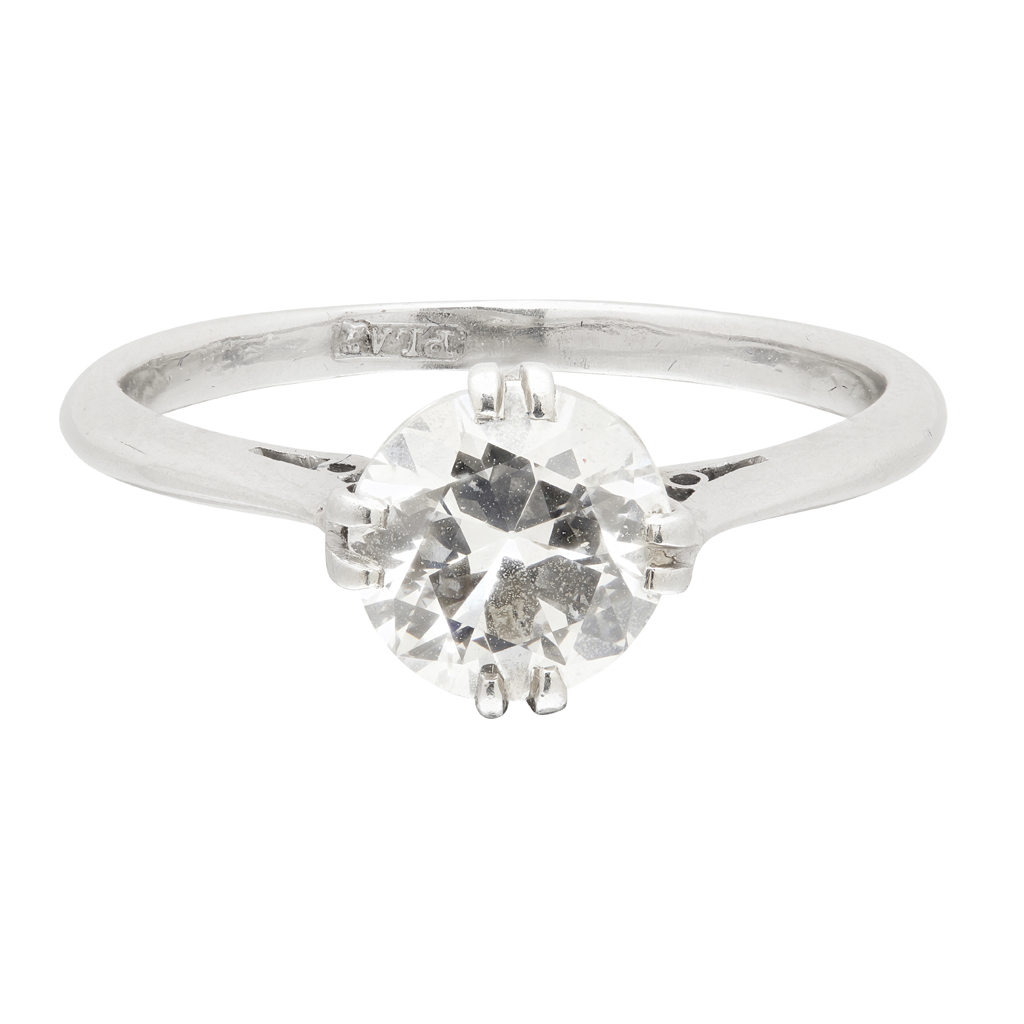claw set with a single round brilliant cut diamond, to a plain white metal shank, stamped PLAT