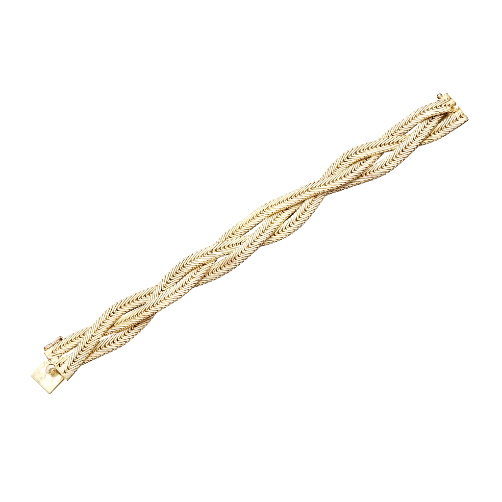 composed of three woven strands of flexible design, to a concealed clasp, stamped 750