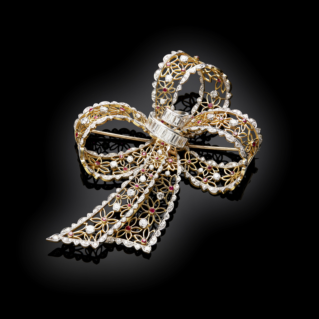 the central scroll channel set with graduated baguette diamonds, the ribbons of pierced floral design set throughout with round cut rubies and round brilliant cut diamonds, apparently unmarked
