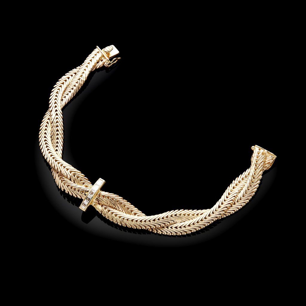 composed of two interwoven strands, the central link channel set with five baguette diamonds, to a concealed clasp with safety clips, indistinctly marked