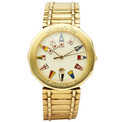 Admiral's Cup model, ref. 39810.56V085, the gold bezel engraved Admiral's Cup, Corum, the dial with signal flags as the hours, date aperture, sweep second hand, 18ct gold bracelet, double fold over clasp, quartz movement
