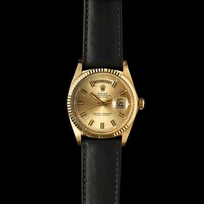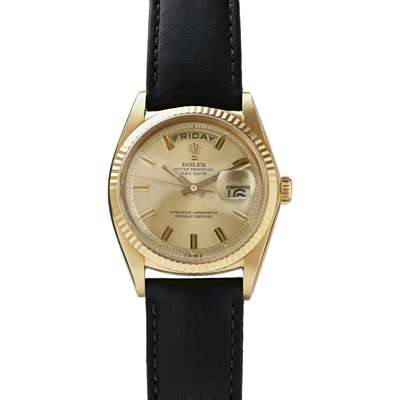 Oyster Perpetual Day Date, Ref. 1803, Serial no. 2076418, circa 1966, bevelled bezel, gilt dial, baton indicators, sweep second hand, screw down crown, with a leather strap