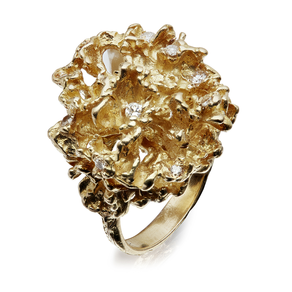 of textured scrolling design, set at intervals with small round brilliant cut diamonds, to a textured shank, indistinctly marked