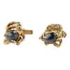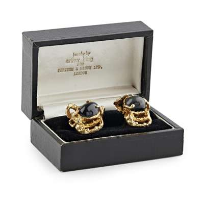 each claw set with a cabochon black cats-eye sapphire, in a stylised asymmetric surround, with torpedo terminals, stamped 18ct, in original box stamped 'Jewellery by Arthur King for Fortnum & Mason, London'