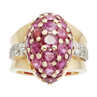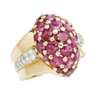 the central ovoid bombé pavé set with round cut rubies, to a waisted tapering bi-coloured metal shank partially pavé set with diamonds, marked inside shank