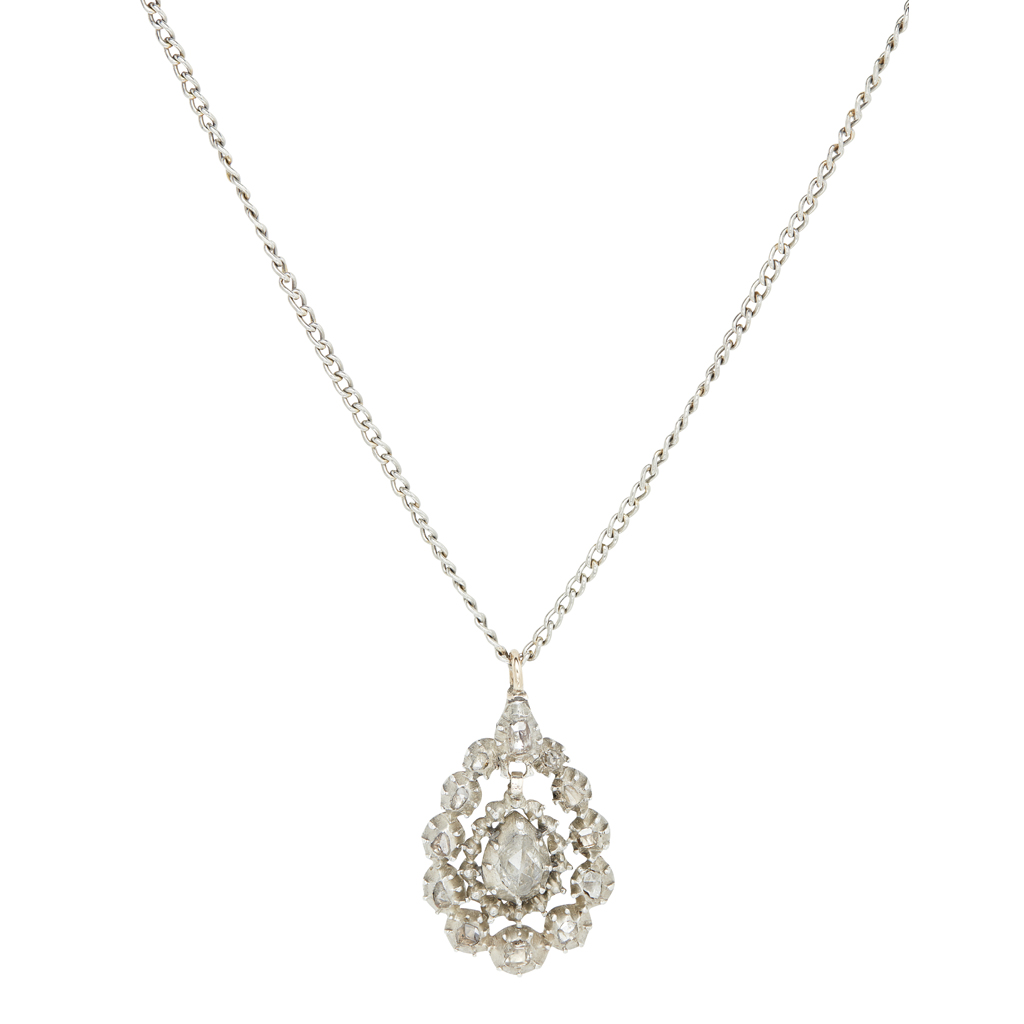 of drop outline, set throughout with rose cut diamonds, the central articulated pendant similarly set, indistinctly marked to reverse, to a curb link chain