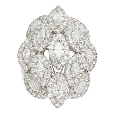 formed as a floral cluster of thirteen marquise brilliant cut diamonds with pavé set diamond haloes to a fluted white metal shank