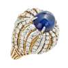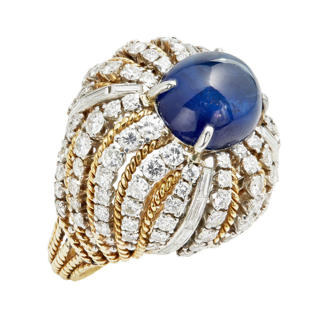 the central claw set oval cabochon sapphire with radiating tendrils of graduated round brilliant cut and baguette cut diamonds between ropetwist metalwork, to a woven shank