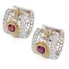 each of hinged hoop design, with pierced detail millegrain set with a circular cut ruby in a border of round cut yellow diamonds, further yellow diamond detail, between a colourless round brilliant cut diamond border, stamped 750, post and clip fittings