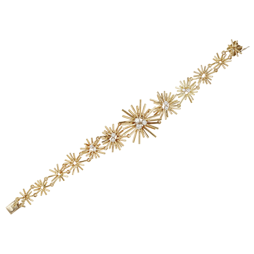 composed of twelve graduated stylised starburst links, the central links set with graduated small round brilliant cut diamonds, to a box clasp and safety clip