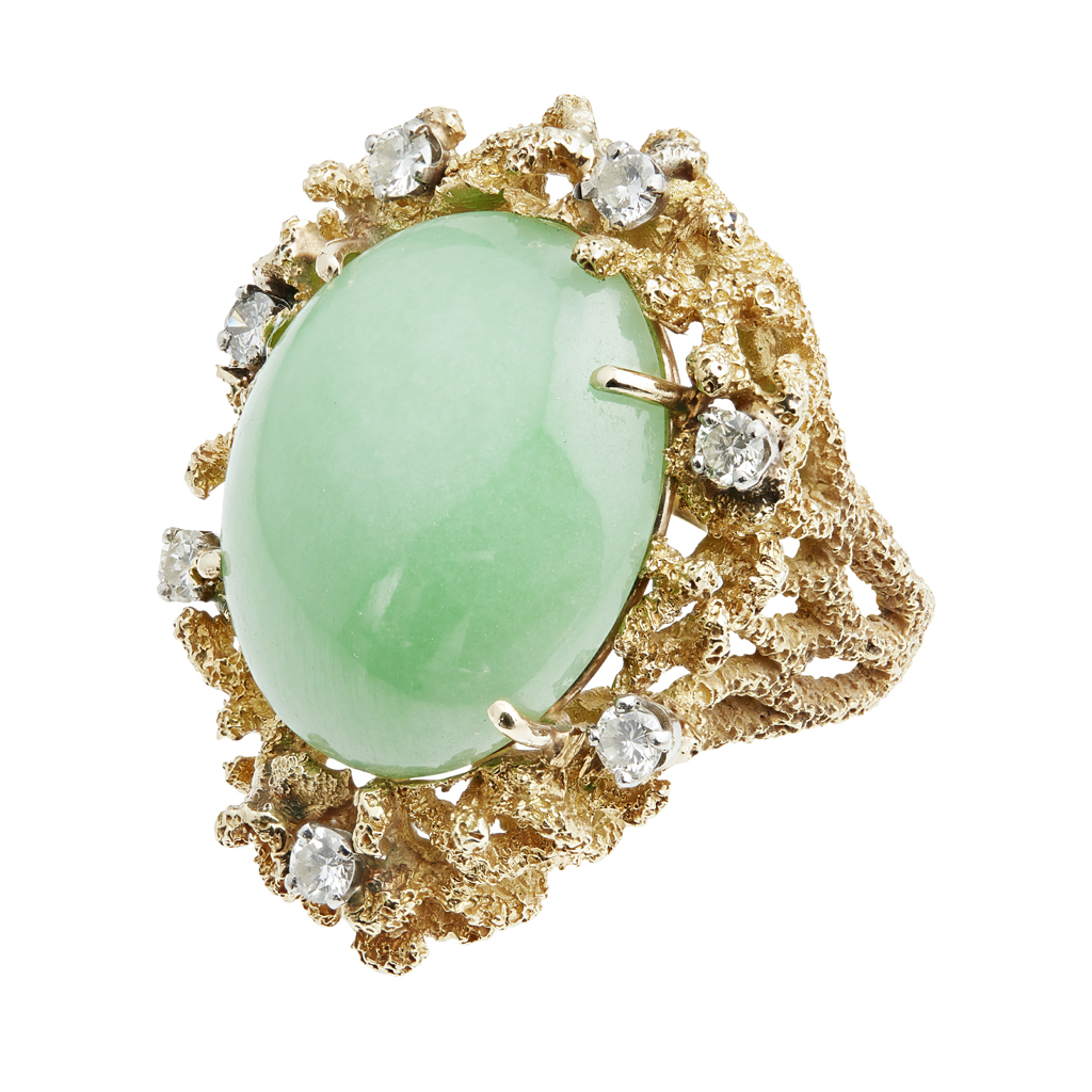 set with an oval cabochon jade within a textured vine-like gold mount claw-set with seven round brilliant diamonds, signed inside shank 'Gb'