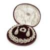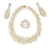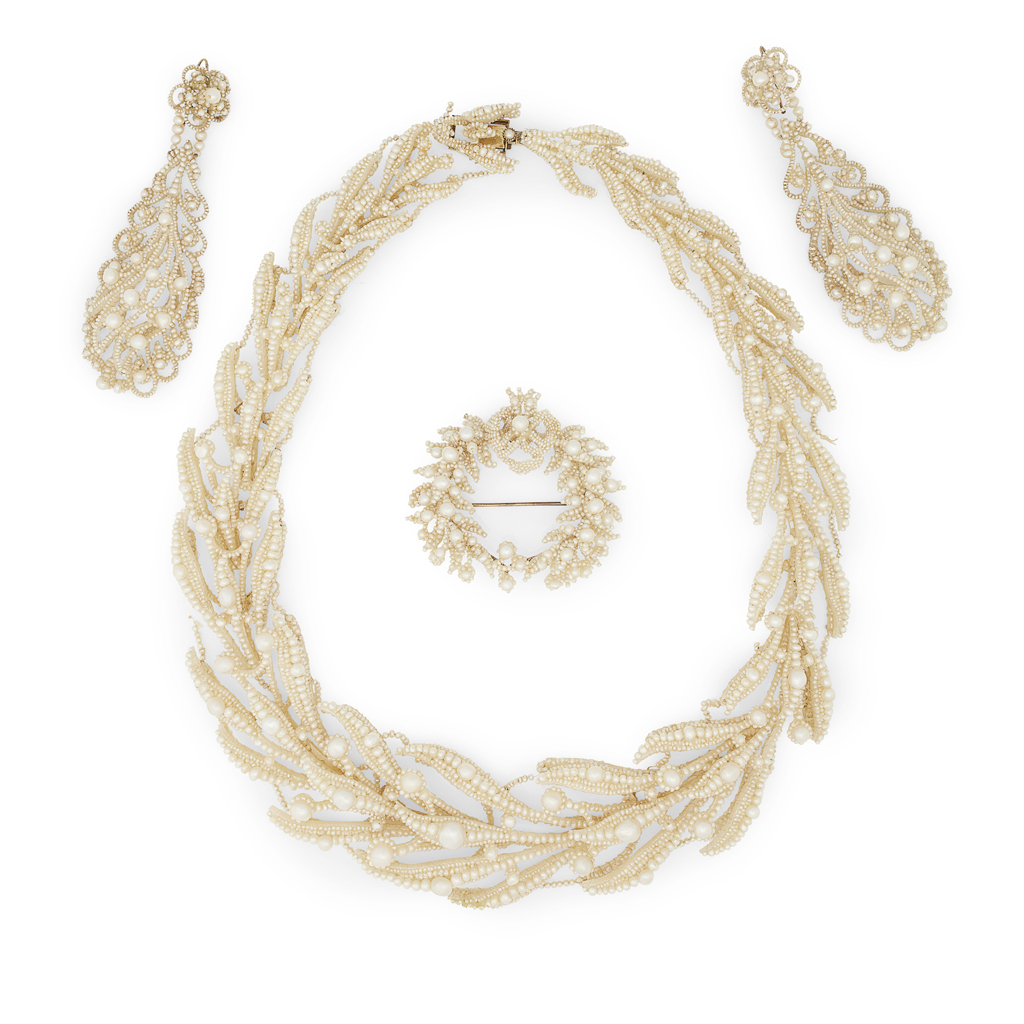 comprising a necklace in the form of a laurel wreath set throughout with graduated woven seed pearls to a plain box clasp; a pair of pendant earrings, of similar design with hook fittings; and a laurel-wreath brooch; all in a fitted box for Widdowson & Veale