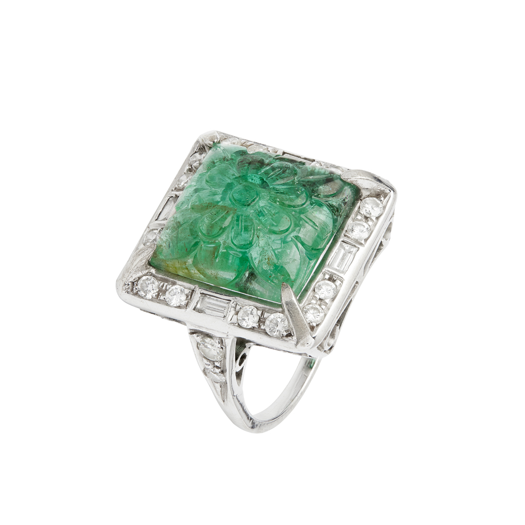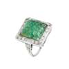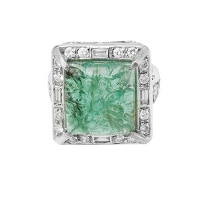 A carved emerald and diamond cluster ring