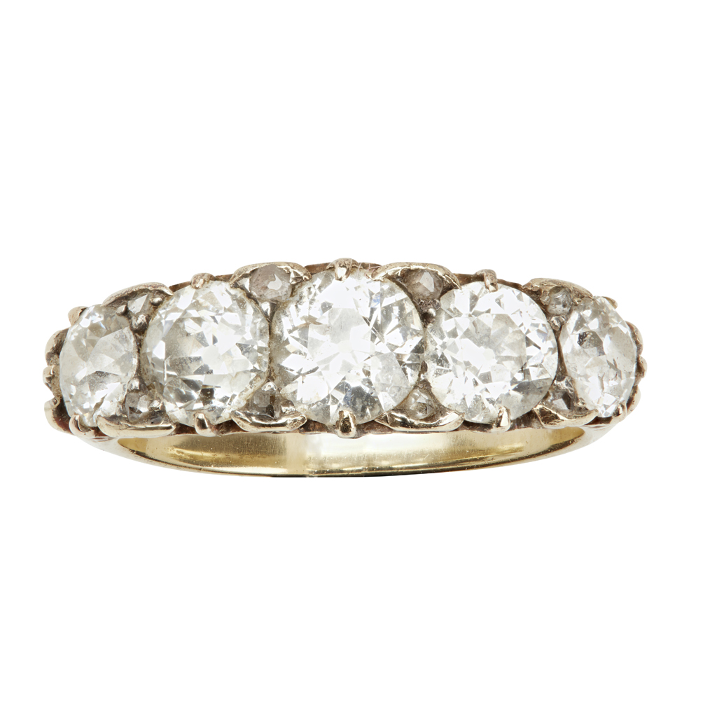 claw set with five old round cut diamonds, diamond chip accents, scrolling detail to gallery, to a plain yellow metal shank