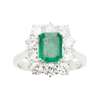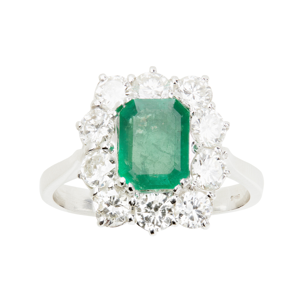 claw set with a trap cut emerald, in a single border of round brilliant cut diamonds, to a plain white metal shank; with accompanying report by GCS, dated 16.07.2018, numbered 78166-66, stating that the emerald is of natural Columbian origin, with significant clarity enhancement