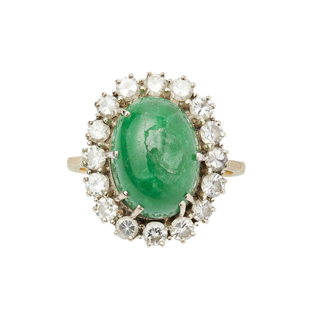 claw set with an oval emerald cabochon, in a single border of sixteen small round cut diamonds, to a plain 18ct gold shank