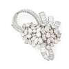 of stylised scrolling design, set throughout with graduated round brilliant, marquise and baguette cut diamonds, modelled in unmarked white metal