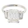 claw set with a trap cut diamond, flanked to either side by a collet set baguette cut diamond, to a plain unmarked white metal shank; accompanied by a GCS report, dated 09.10.18, numbered 79181-03, stating that the principal diamond is 5.03cts, J colour, SI1 clarity