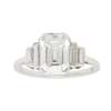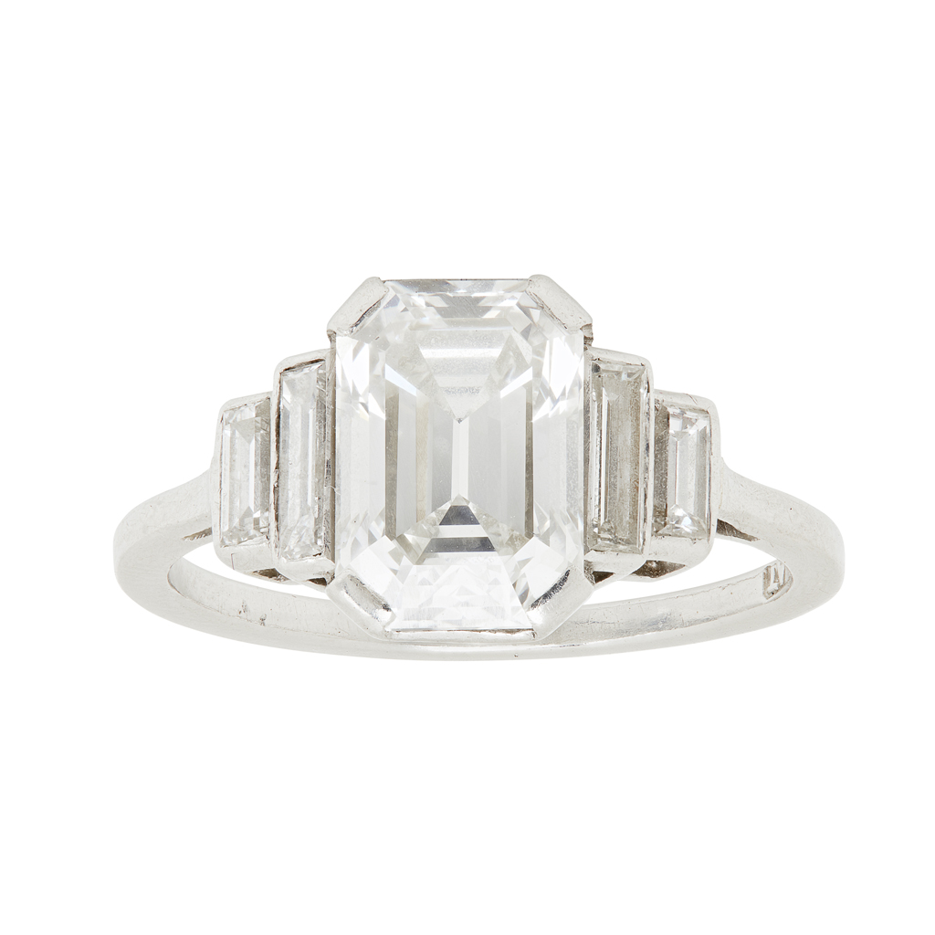 claw set with a trap cut diamond, flanked to either side by two graduated collet-set baguette cut diamonds, to a plain white metal shank stamped PLAT