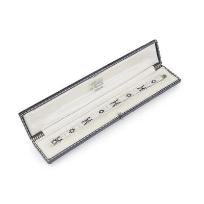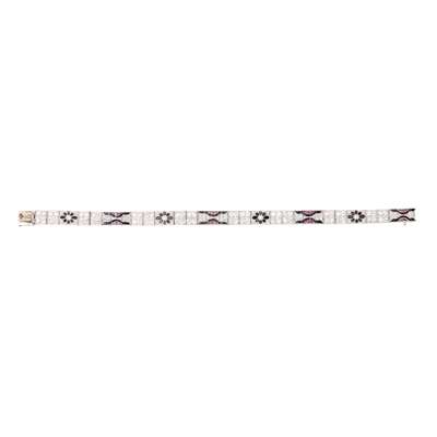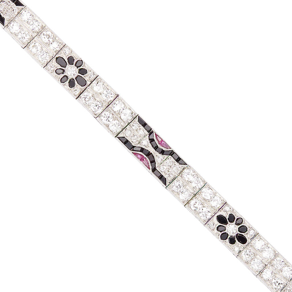 composed of articulated links, set throughout with old round and eight-cut diamonds, with ruby and onyx detail in a stylised foliate and geometric design, concealed clasp, in a fitted box for L. Mumford ... London