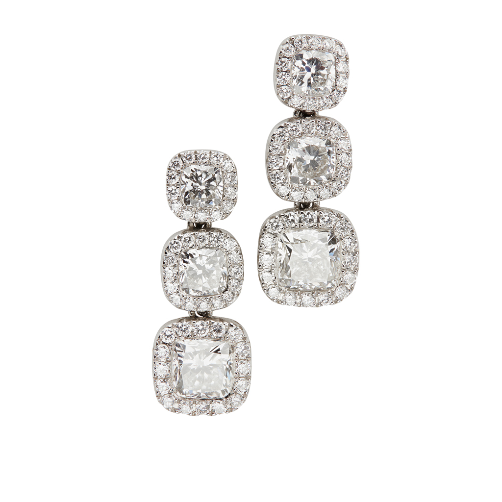 from the Aura collection, each composed of three graduated diamond set clusters, set with a central cushion cut diamond in a border of small round brilliant cut diamonds, to post and butterfly fittings