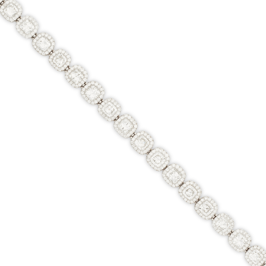 from the Aura collection, composed of twenty-seven diamond set clusters, each claw set with a cushion cut diamond, in a single border of small round brilliant cut diamonds, to a concealed clasp and safety clips