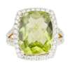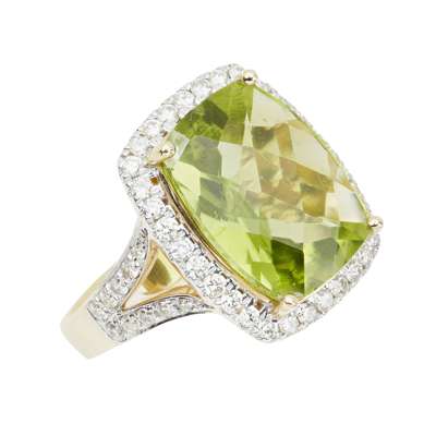 claw set with a cushion mixed cut peridot, in a single border of round brilliant cut diamonds, the split shoulders similarly set, shank stamped 750