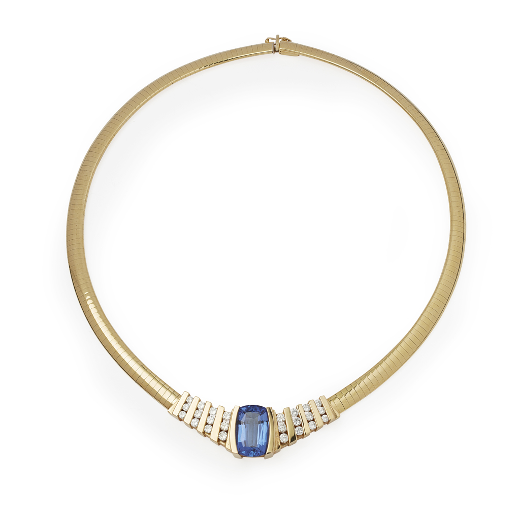 bar set with a cushion cut Tanzanite, flanked to either side by four rows of three similarly set round brilliant cut diamonds, the whole to an articulated link collar, stamped 18K CEI