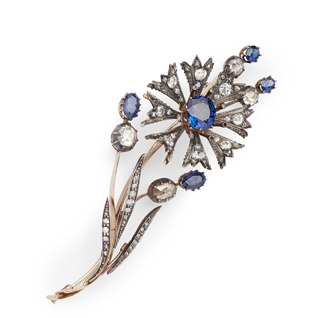 the principal en tremblant flowerhead set with a central cushion cut sapphire and throughout with old round cut diamonds, also set with four rose cut diamonds and four oval cut sapphires, with small old round and rose cut diamond detail, indistinct marks to reverse