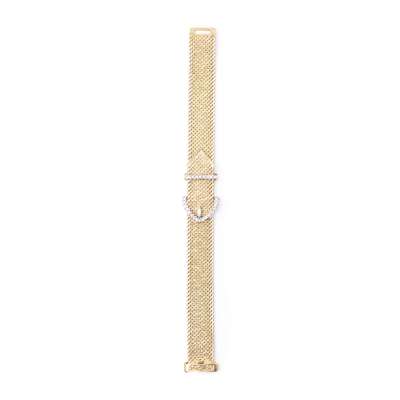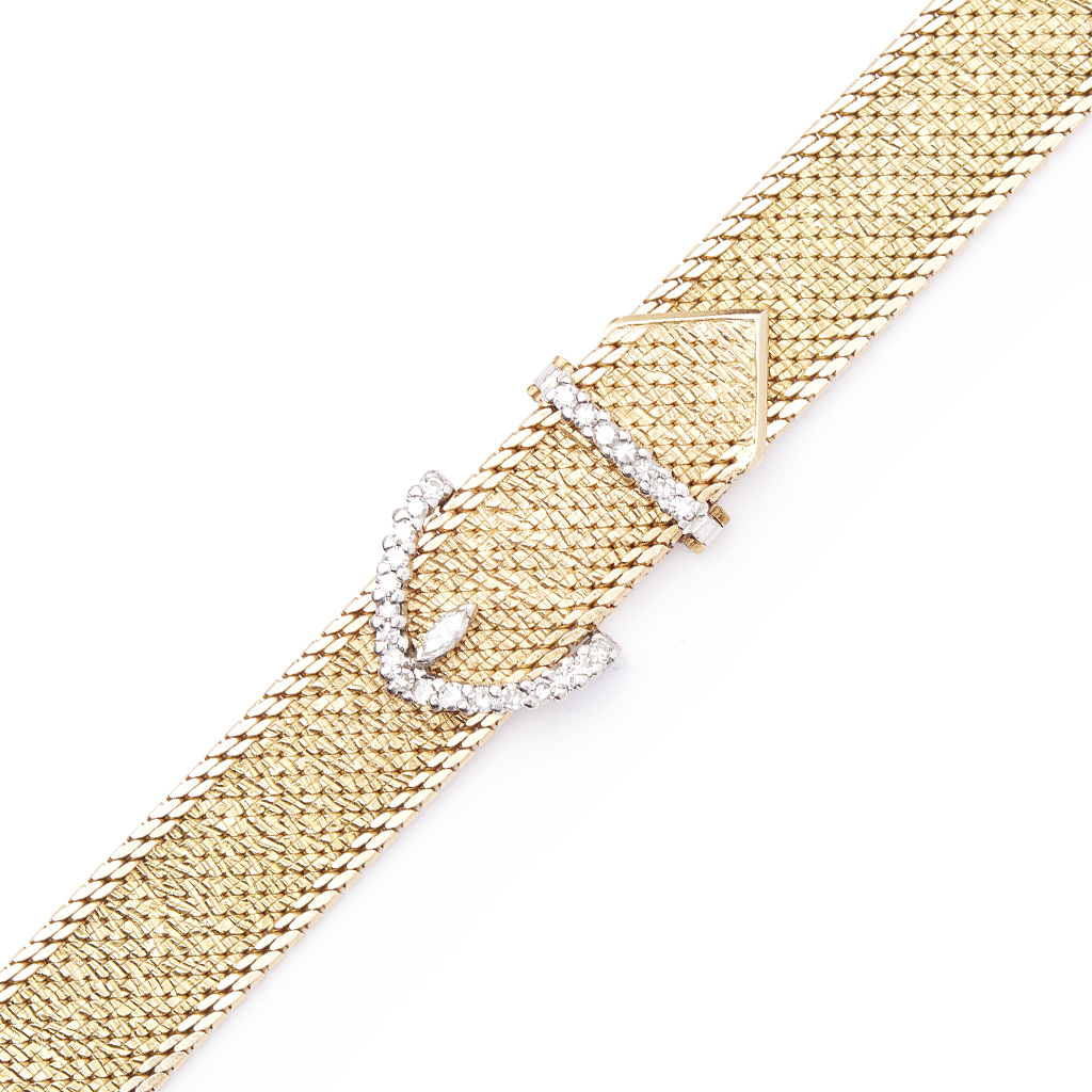 modelled as a buckle, set with eight cut diamonds and a single marquise cut diamond, to a textured woven link finish