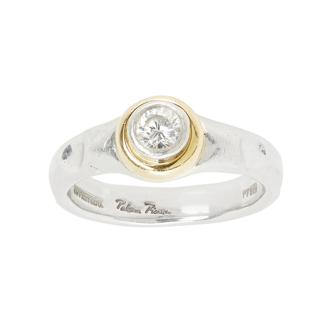 collet set with a round brilliant cut diamond, to a plain platinum shank with ribbed detail, stamped T&Co TIFFANY & CO PT950 750, signed Paloma Picasso
