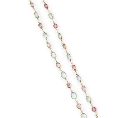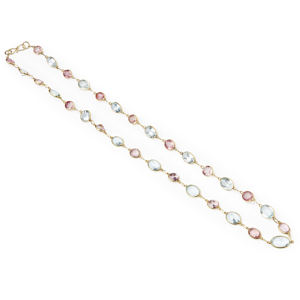 composed of an alternating row of collet set oval, round and cushion cut pink tourmalines and aquamarines, to a simple hook clasp, stamped 585