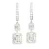 each formed as two graduated rectangular panels, pavé set with an emerald cut diamond, four baguette cut diamonds and four round brilliant cut diamonds, the larger with round brilliant cut diamond surround, all dependent from a partially pavé set hoop, stamped 750