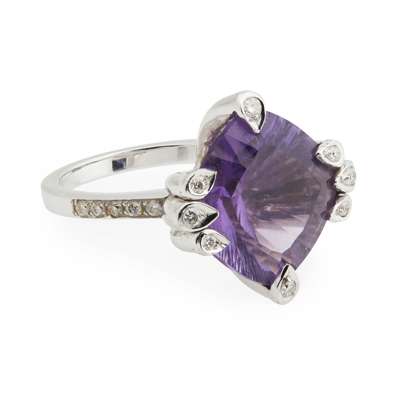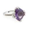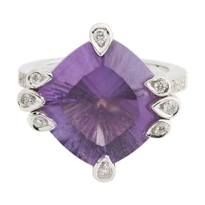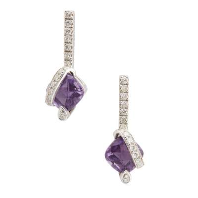 comprising a pendant, pair of earrings and a cocktail ring; the ring claw set with a fancy cut amethyst, the shoulders and claws set with round cut diamonds; the necklace and pendant earrings with cross over diamond set band, all stamped 750 (3)