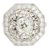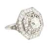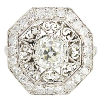 claw set with an old cut diamond within a border of filigree scrolls and an outer octagonal border pavé set with old round cut diamonds within millegrain panels, to tapering shoulders further pavé set with diamonds, apparently unmarked
