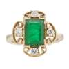 claw set with a rectangular mixed cut emerald within a scrolling wirework surround, further claw set with four round brilliant cut diamonds, to a plain tapering shank