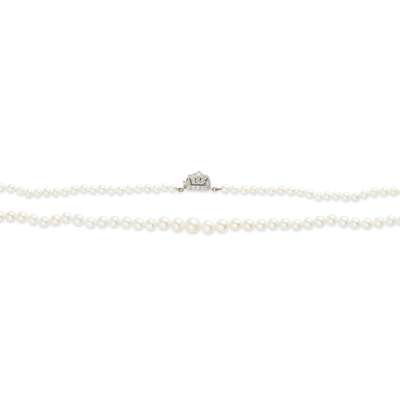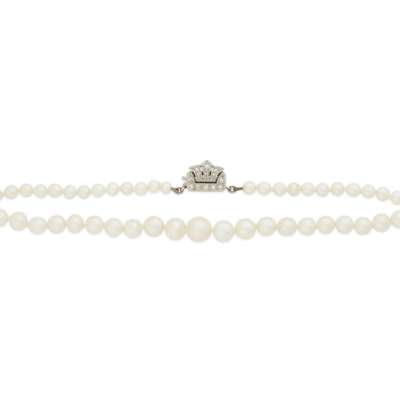 composed of a single strand of graduated pearls, to a stylised clasp set with graduated eight-cut diamonds, stamped 18ct PLAT, with accompanying report from The Gem & Pearl Laboratory, dated 29 March 2019, numbered 17047, stating the pearls are natural saltwater variety