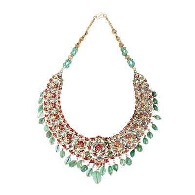 with a foliate lattice of carved foiled emeralds between table and rose cut diamonds and cabochon rubies, with tumbled emerald pebbles dependent, the reverse enamelled with flowers and foliage in cornflower blue, cream, and translucent green and red