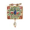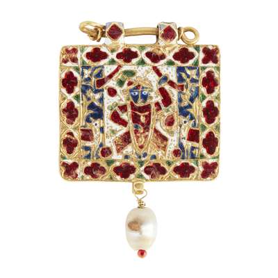 rectangular, enamelled in white, translucent red, green and blue enamel to one side with a peacock and the other with Krishna, a beaded freshwater pearl dependent