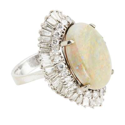 claw set with an oval opal cabochon in a ballerina surround, claw set with tapered baguette and round brilliant cut diamonds, to a plain shank stamped 585 14k