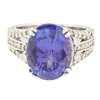 claw set with an oval cut Tanzanite, the split shoulders and gallery set throughout with small round brilliant cut diamonds