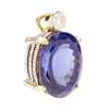 claw set with a large oval mixed-cut Tanzanite below a collet set round brilliant cut diamond, the three row gallery set throughout wiht small round brilliant cut diamonds